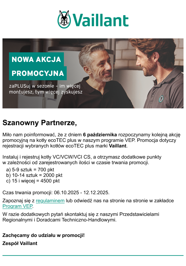 Z przyjemnością informujemy, że od 6 października 2025 r. wystartowała nowa akcja promocyjna marki Vaillant w ramach programu lojalnościowego VEP.